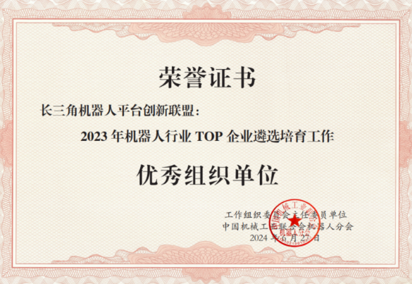 牽頭發(fā)起的長三角機(jī)器人產(chǎn)業(yè)平臺(tái)創(chuàng)新聯(lián)盟獲中國機(jī)械工業(yè)聯(lián)合會(huì)機(jī)器人分會(huì)“機(jī)器人行業(yè)TOP企業(yè)遴選培育工作優(yōu)秀組織單位”獎(jiǎng)。