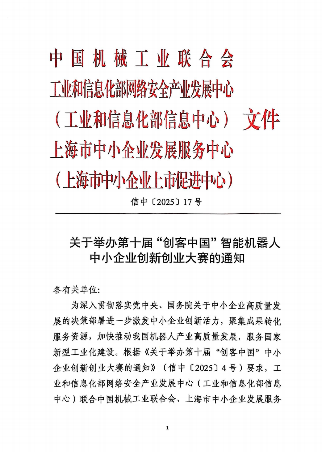 2025年4月17日,第十屆“創(chuàng)客中國”智能機器人中小企業(yè)創(chuàng)新創(chuàng)業(yè)大賽新聞發(fā)布會在上海召開,大賽正式啟動。本次大賽由中國機械工業(yè)聯(lián)合會、工業(yè)和信息化部網(wǎng)絡(luò)安全產(chǎn)業(yè)發(fā)展中心(工業(yè)和信息化部信息中心)、上海市普陀區(qū)政府、上海市中小企業(yè)發(fā)展服務(wù)中心(上海市中小企業(yè)上市促進中心)主辦,由中國機械工業(yè)聯(lián)合會機器人分會、上海電器科學(xué)研究所(集團)有限公司、jiuyou.com九游(中國)機器人有限公司官網(wǎng)承辦。