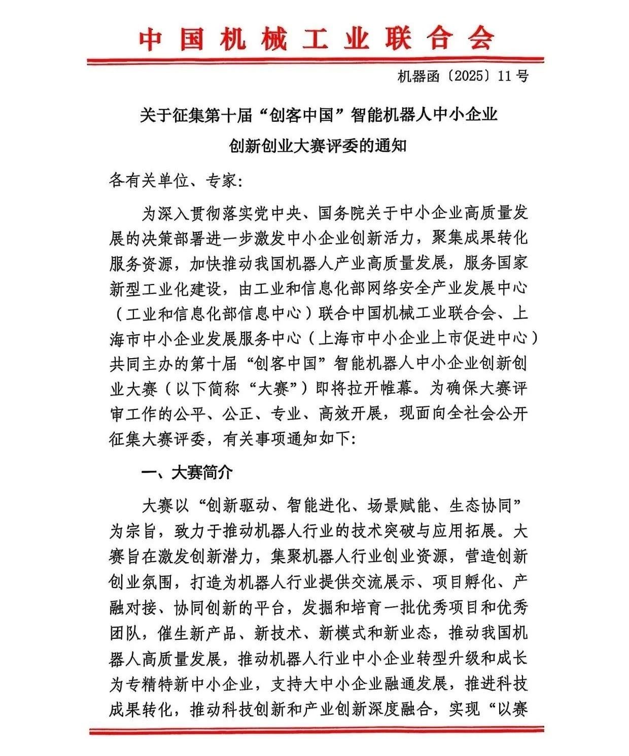 關于征集第十屆“創客中國”智能機器人中小企業創新創業大賽評委的通知.pdf