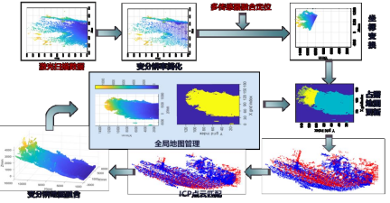 全局三維真彩點云環境建模在軟件和硬件的基礎上搭建交互平臺,通過人機操作界面收集相機圖像以及中控通信模塊的點云數據、位姿信息,并且能利用點云數據對圖像進行拼接處理得到合成圖像,從而獲取三維真彩點云圖。