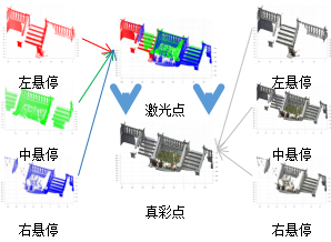 由無人機搭載的激光掃描儀從不同的懸停角度對目標物進行掃描后合成三維激光點云模型進而由雙目拍攝系統所拍攝的真彩圖像進行聯合標定真彩覆蓋,達成數據融合,以形成最終的真彩點云模型。