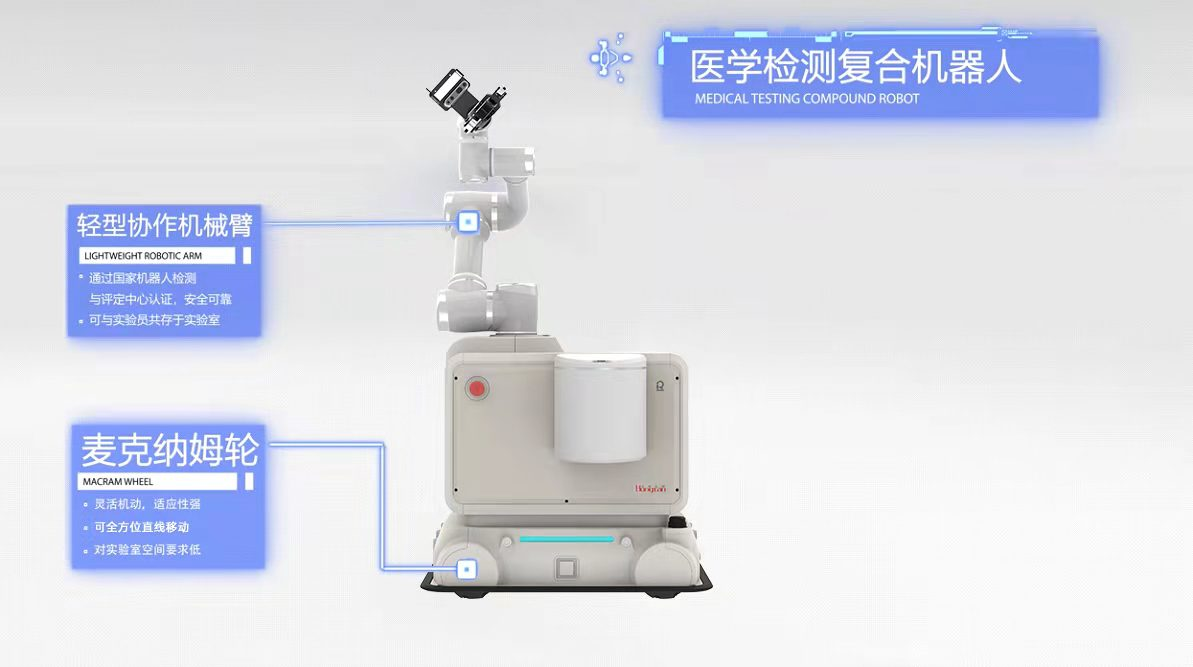 醫(yī)學(xué)檢測復(fù)合機器人采用麥克納姆輪底盤搭載輕型協(xié)作機械臂,麥克納姆輪底盤降低了平面內(nèi)任意點到點移動方式的限制,靈活機動,可全方位移動;小巧的機身擁有獨具特色的貼墻行走功能,可靈活穿行于擁擠的實驗室;強大的感控能力,能在各種光照條件下穩(wěn)定工作,使復(fù)合機器人具備很強的環(huán)境適應(yīng)能力。